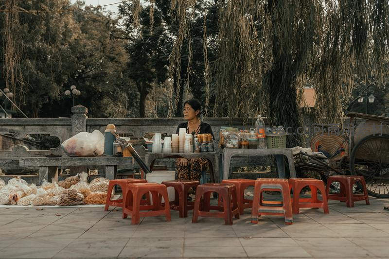 树荫下的街边小吃摊,红色塑料凳静候食客