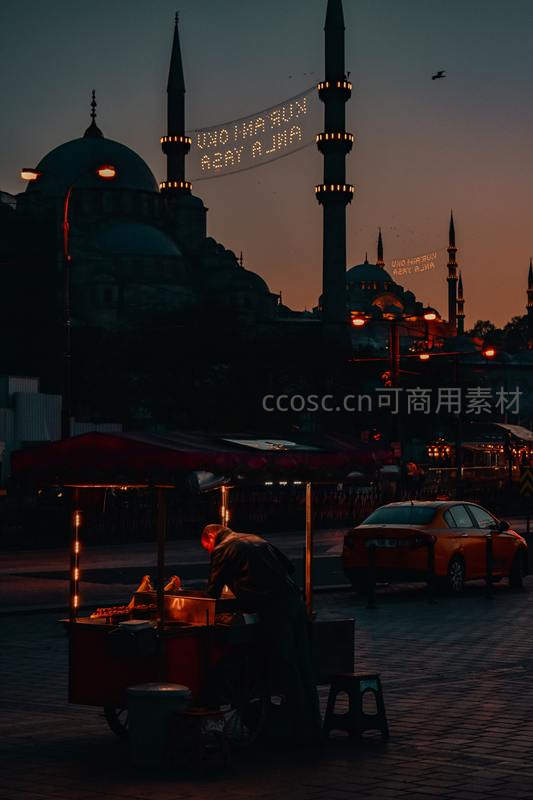 夕阳西下,宏伟的清真寺剪影矗立在背景中,前景是一位小贩在亮着暖光的推车旁忙碌,橙色出租车停在路边,构成一幅宁静而充满人文气息的都市黄昏图景。