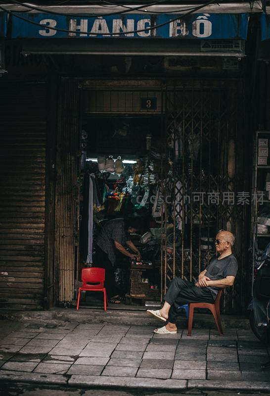 一家挂着“3 HÀNG BÔ”招牌的老店铺前,一位老人坐在塑料椅上悠闲地晒着太阳,店内杂货琳琅满目,展现了地道的东南亚市井生活画卷。