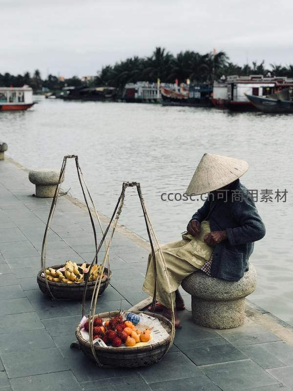 河边女贩戴斗笠守候水果篮