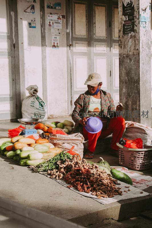 一位戴着帽子和口罩的女菜贩坐在老式门廊下,阳光洒在她面前摆放整齐的蔬菜和干货上,她正低头整理商品,画面宁静而充满生活质感。