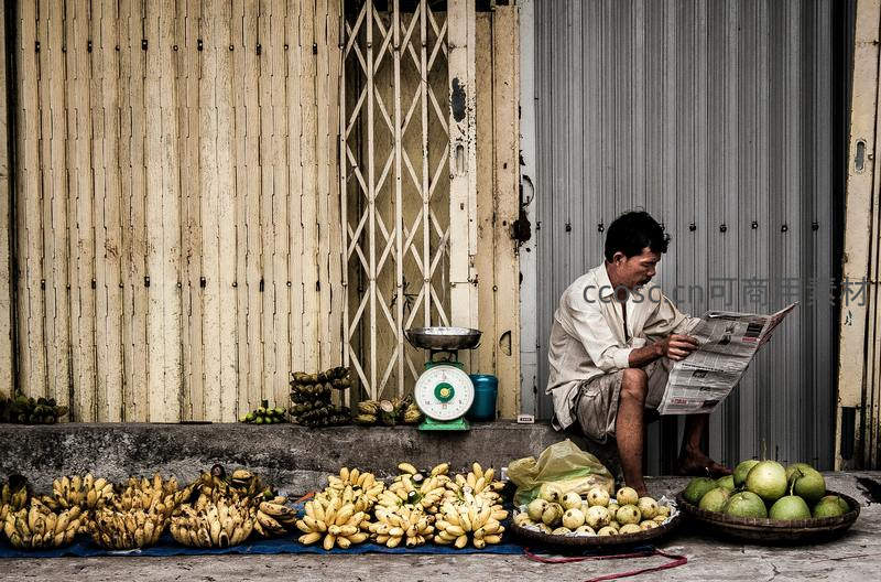 一位小贩在街边水果摊前坐着,专注地阅读报纸,身旁摆放着成堆的香蕉和椰子,展现了市井生活的宁静与日常。