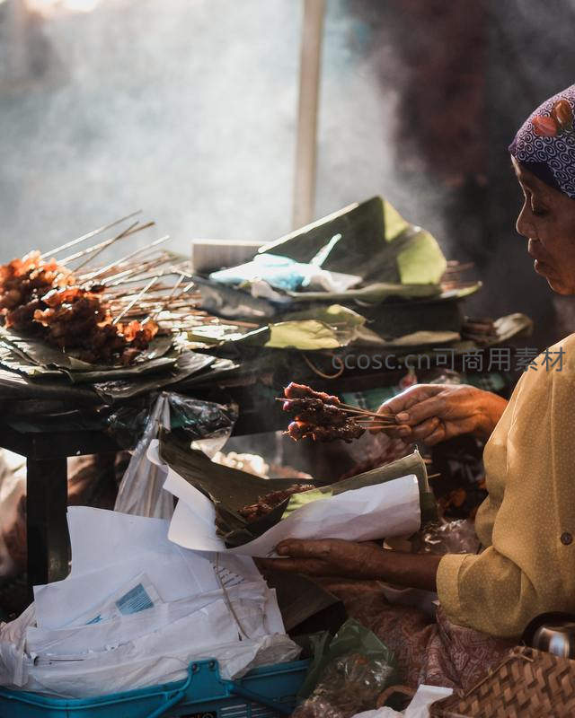 一位摊主正在精心准备印尼传统烤肉串,烟雾缭绕中,食物色泽诱人,展现了地道东南亚街头美食的制作过程与风味。