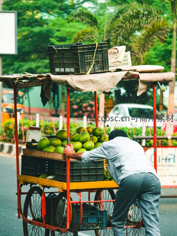 一名男子在城市街道旁弯腰整理装满青芒果的三轮手推车,背景是绿树和车辆,展现了充满烟火气的日常街头经济与劳动场景。