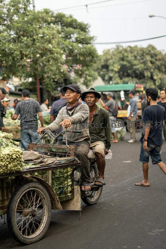 两名男子驾驶一辆装满新鲜蔬菜的三轮车,在熙攘的露天市场中穿行,背景是忙碌的摊贩和行人,展现市井生活的活力与真实。