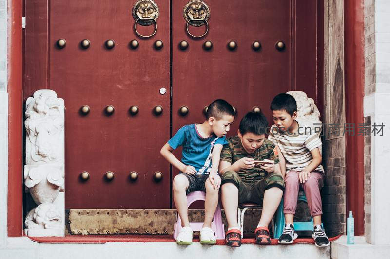 三个男孩坐在一座传统中式红色大门前的台阶上,全神贯注地盯着手中的手机屏幕,古老门环与现代科技形成鲜明而有趣的对比。