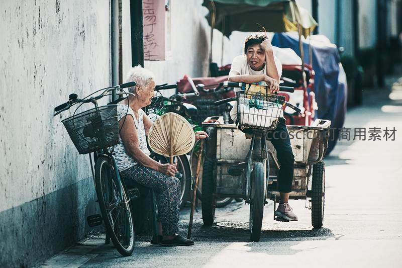 两位老人在街边闲坐,一位手持蒲扇,另一位倚靠在三轮车上,阳光洒在他们身上,展现了平凡日子里邻里间的温情与惬意。