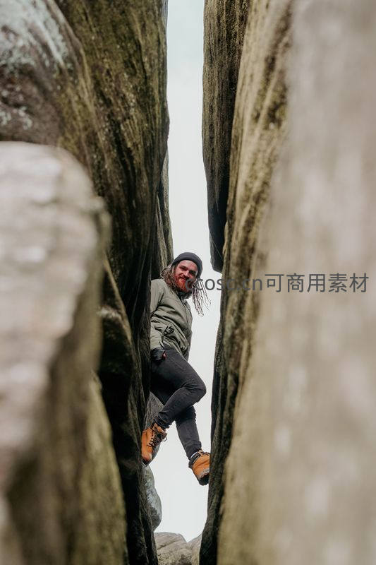 一位留着长发的探险者卡在两块巨大岩石之间,面带轻松微笑,脚踏登山靴,背景天空灰白,展现出亲近自然时的趣味与从容姿态。