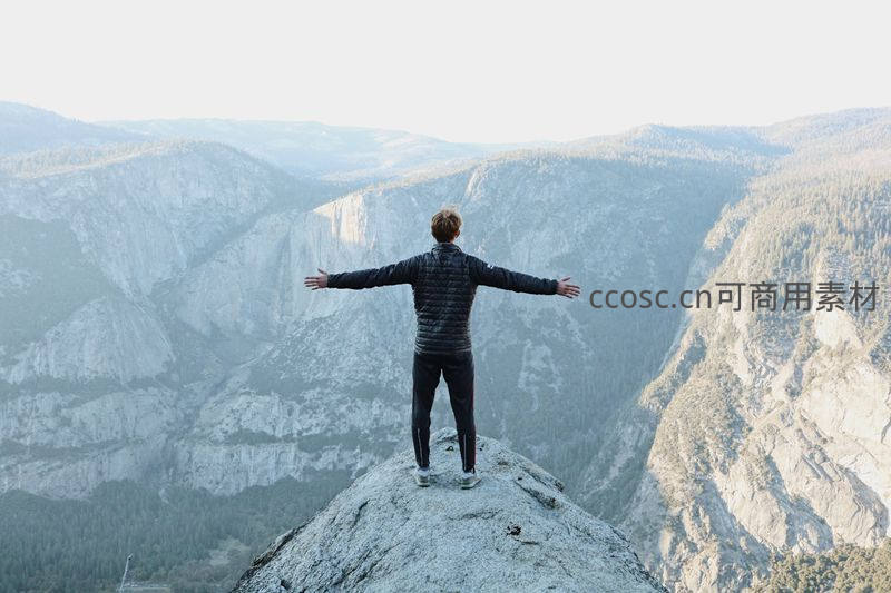 一人背对镜头站在山巅,双臂舒展,面对广阔无垠的山谷与森林,晨雾弥漫,阳光洒落,传递出征服高峰后的豁达与心灵的彻底释放。
