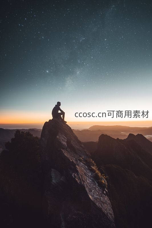 在璀璨银河与地平线余晖的映衬下,一人静坐嶙峋山巅,享受宇宙浩瀚与内心安宁,是自然与心灵的对话。