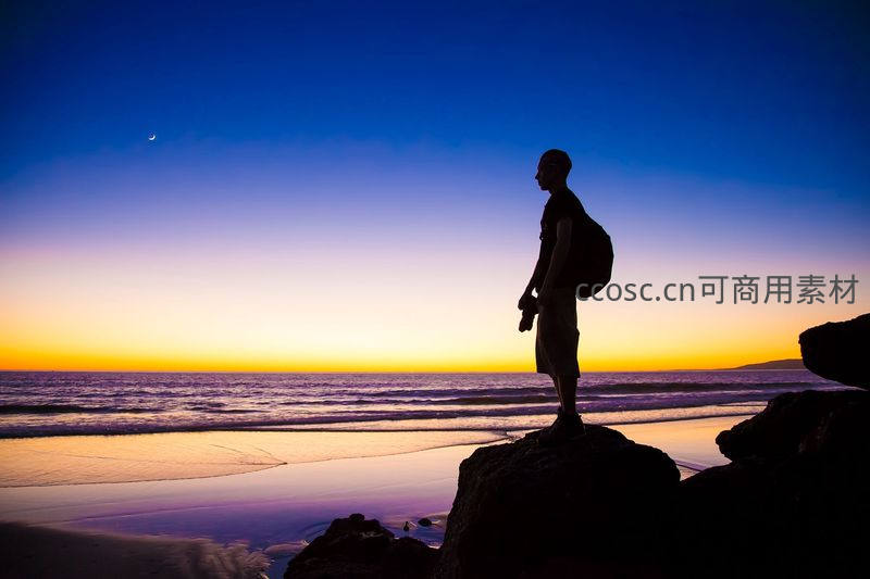 背负行囊的身影伫立礁石,凝望渐变天幕下的新月与海面余晖,勾勒出旅途中片刻的沉思与对远方的向往。