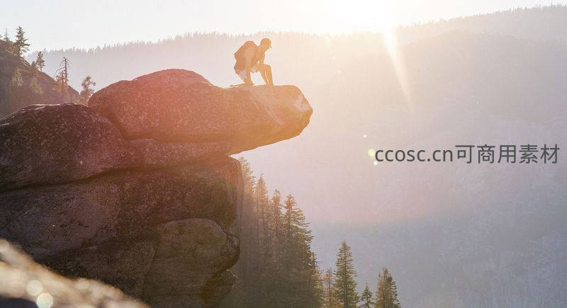 日出时分,登山者静坐悬崖之巅俯瞰山林