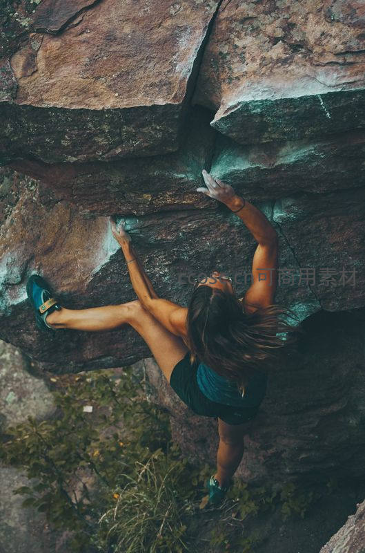 一位身着运动装的女子正专注地攀爬在粗糙的岩壁上,她的身体舒展,双手紧握岩点,展现出力量与技巧的完美结合。