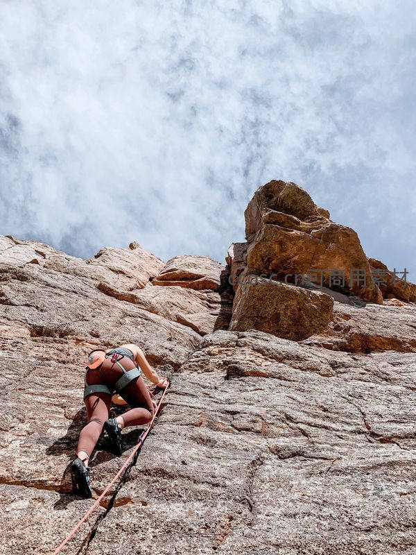 仰视视角下的女性攀岩者挑战高峰