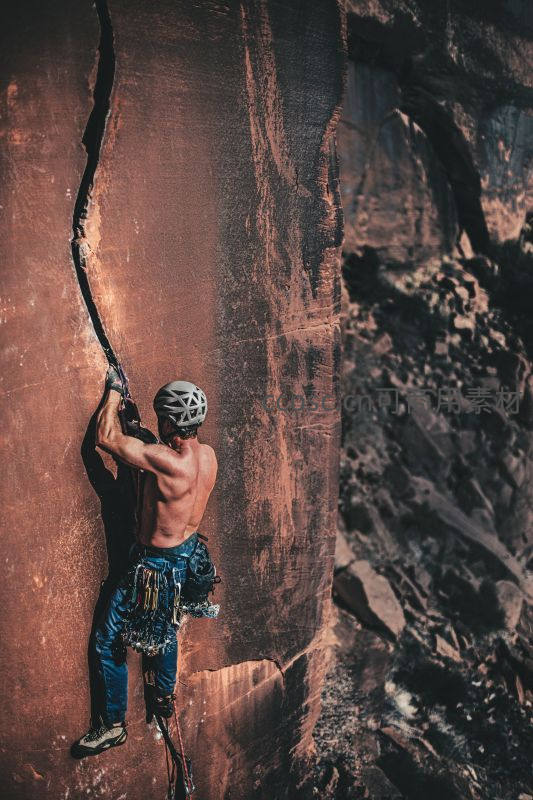 攀岩者征服赤色峭壁的惊险瞬间