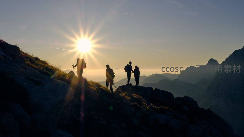 四位登山者站在崎岖的山脊上,背对耀眼的朝阳,形成完美的黑色剪影。远处层峦叠嶂,天空由金黄渐变为淡蓝,充满征服与宁静之感。