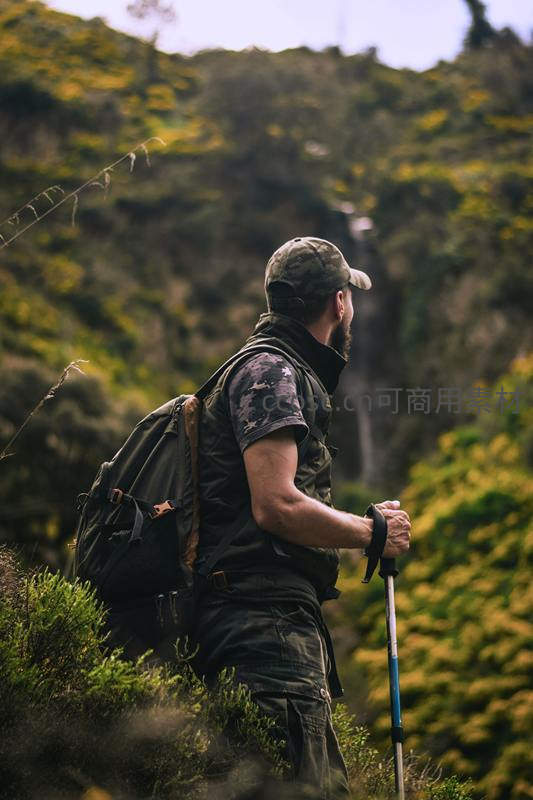 一位蓄着胡须的男性徒步者手持登山杖,背着大容量背包,在茂密的绿色灌木丛中前行,专注于前方的山林小径。