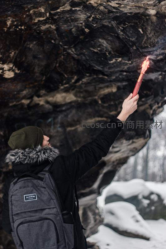 一名身着冬装的探险者在积雪覆盖的岩壁下高举燃烧的火把,火焰在寒冷中跳跃,映照出坚毅的侧影,充满神秘与挑战气息。