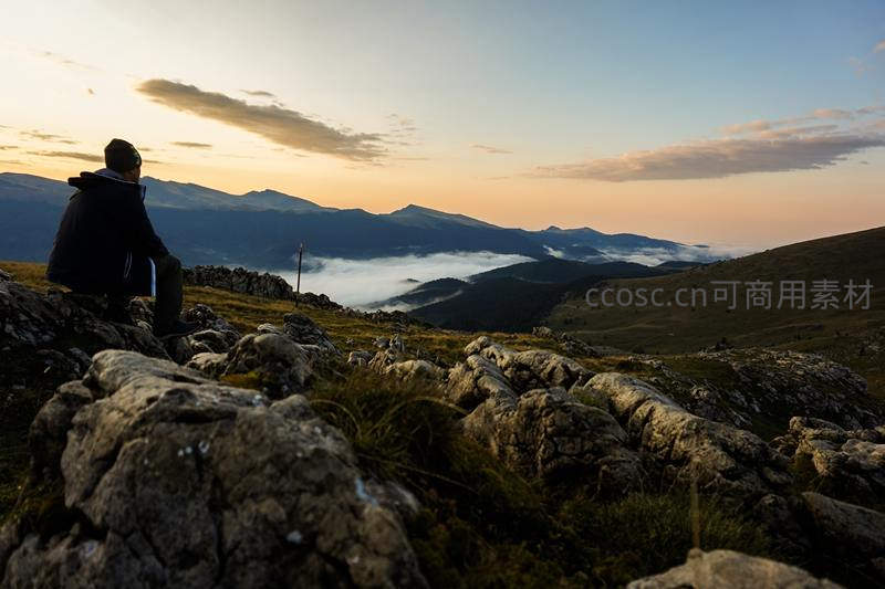 一位旅行者坐在山顶岩石上,背对镜头,凝视着远方被霞光染红的云海与连绵山脉,享受着大自然的壮丽与内心的平静。