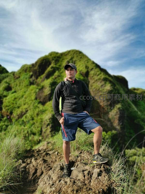 一名装备齐全的徒步者站在布满青草的山丘小径上,背景是郁郁葱葱的山坡和湛蓝天空,他面带微笑,展现出征服自然后的满足与自信。