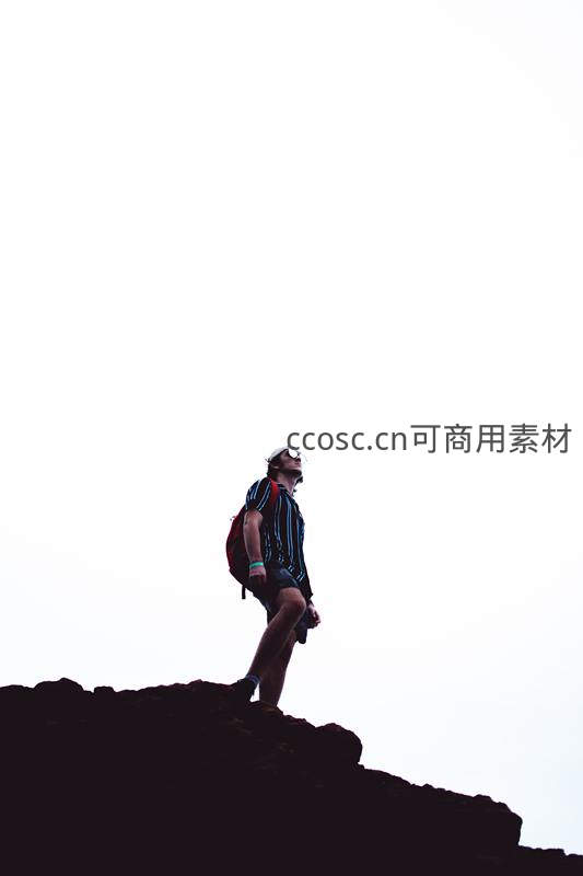 一位背包客独自站在山巅之上,背对镜头仰望无垠天空,展现出征服自然后的宁静与豪情,象征着人类对未知的探索精神。