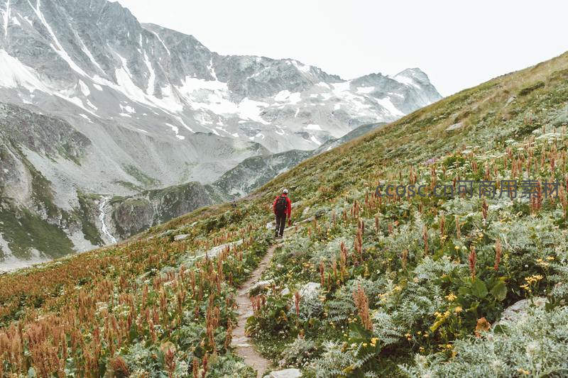 徒步者穿行高山花海,远眺雪峰巍峨