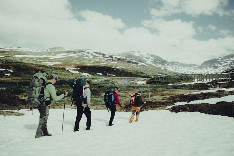 四位徒步者背着大背包,手持登山杖,在覆盖着残雪的山地间前行,远处是连绵起伏的雪山和开阔的荒野。