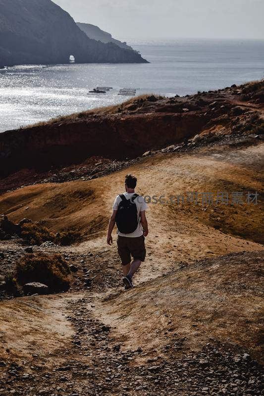 一名背着黑色背包的男子沿着崎岖土路走向海边悬崖,远方海面波光粼粼,远处小船点缀,尽显旅行的宁静与辽阔。
