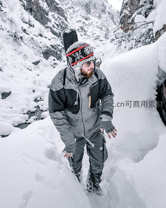 一名男子身着专业防寒服,头戴毛线帽,在被厚厚积雪覆盖的峡谷中艰难跋涉,背后背着滑雪板,展现出不畏严寒的探险精神。