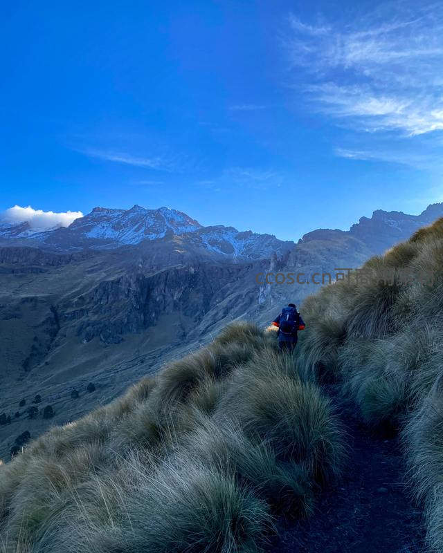 孤身行走在高山草甸,远眺雪峰与蓝天
