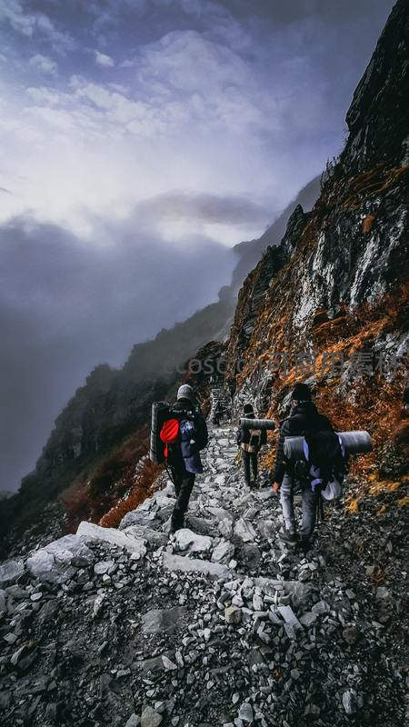 三名背着沉重行囊的徒步者在布满碎石的陡峭山路上艰难前行,一侧是覆盖着秋色植被的岩壁,另一侧是云雾缭绕的深谷,充满冒险气息。