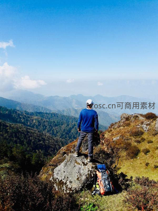 一名男子背对镜头站在山顶岩石上,身着蓝色上衣与白色帽子,身旁放着登山包,远眺层峦叠嶂的绿色山脉与晴朗天空。