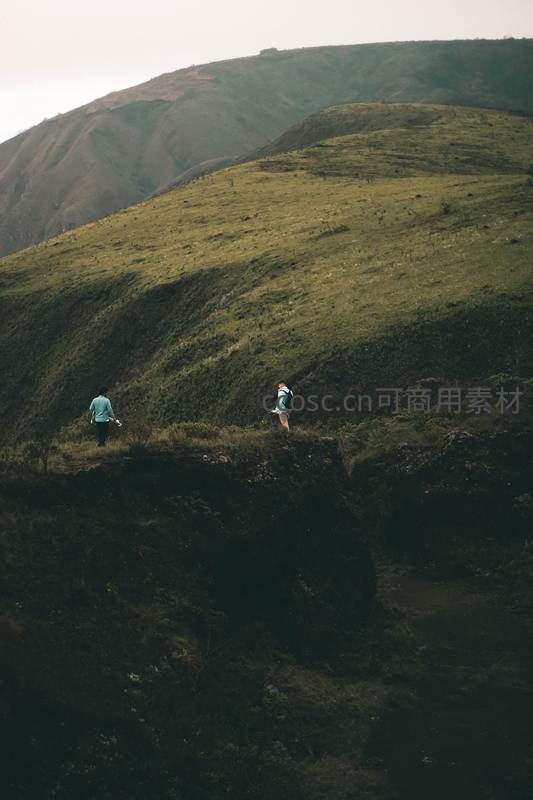 两位徒步者行走在覆盖着青草的山脊上,背景是连绵起伏的绿色山峦,在柔和光线下构成一幅宁静而壮丽的自然画卷。