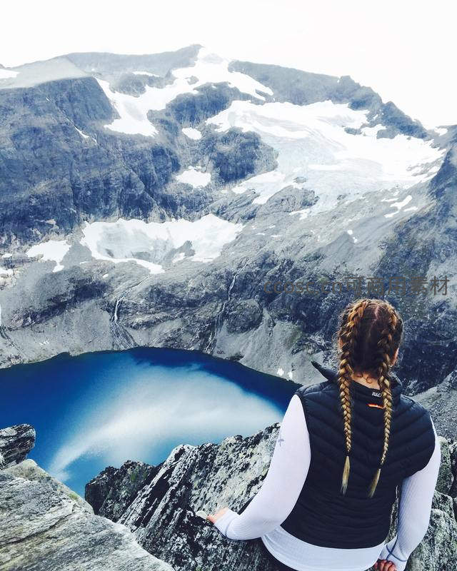 一位旅者站在高处俯瞰深蓝色冰川湖,背后是白雪覆盖的巍峨群山,纯净的山水相映成趣,传递出大自然的原始与震撼之美。