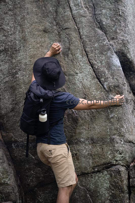 男子徒手紧贴巨大岩壁向上攀登,身背水壶与背包,专注而有力,展现不借助装备的原始攀爬技艺与对自然地形的征服意志。