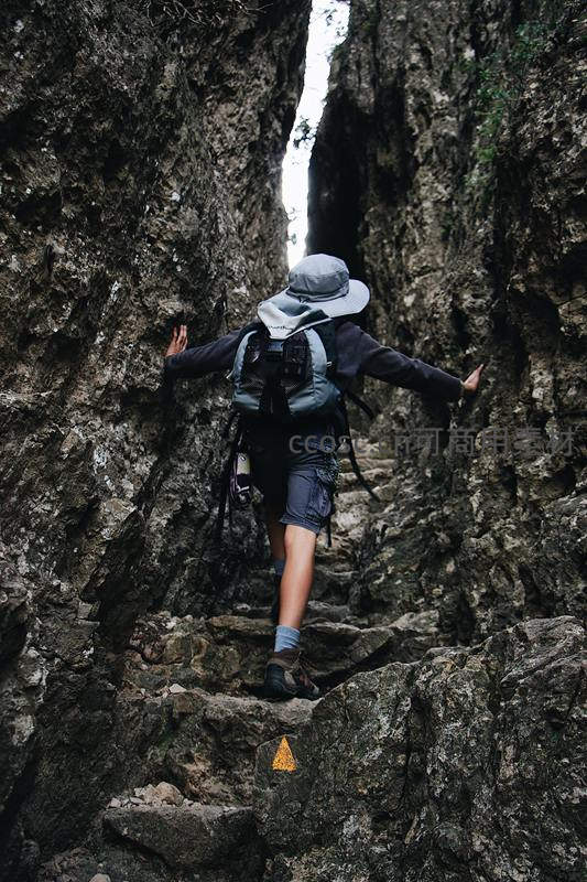 探路者双手扶壁,在狭窄岩缝中拾级而上