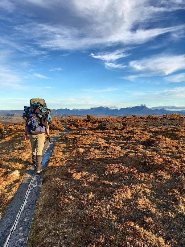 背包客行走在秋日苔原的木栈道上