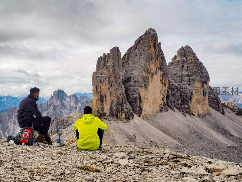 两位登山者坐在碎石山顶,背对镜头,凝视着前方陡峭嶙峋的巨大岩壁。云层低垂,群山环绕,营造出宁静而震撼的高山氛围。