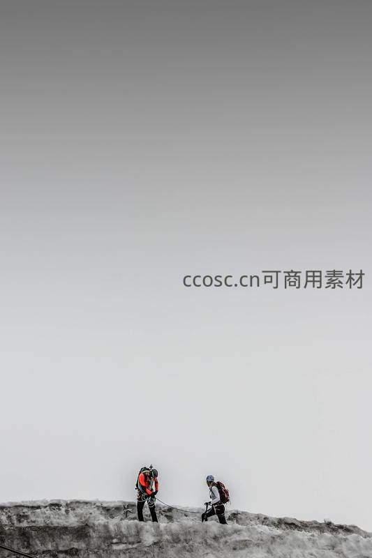两名装备齐全的登山者在白雪覆盖的山脊上相互协作,绳索相连,共同面对严酷环境,展现了人类挑战自然、勇攀高峰的无畏精神。