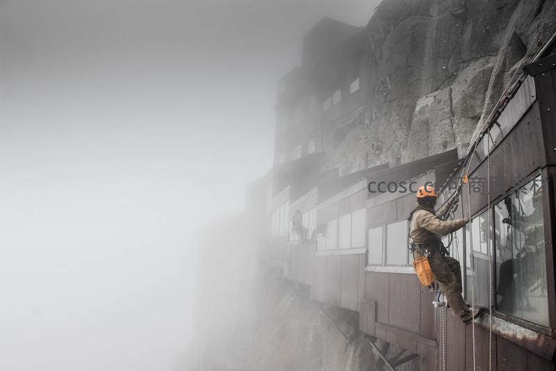 一名工人身系安全绳,在浓雾弥漫的悬崖峭壁上的观景台外侧进行清洁工作,背景是朦胧的山体和建筑,凸显其工作的危险与敬业。