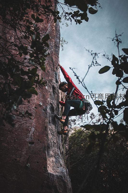一位身穿红色外套的攀岩者正奋力向上攀登一面高耸的岩石峭壁,周围绿叶环绕,展现了人与自然的对抗与和谐。