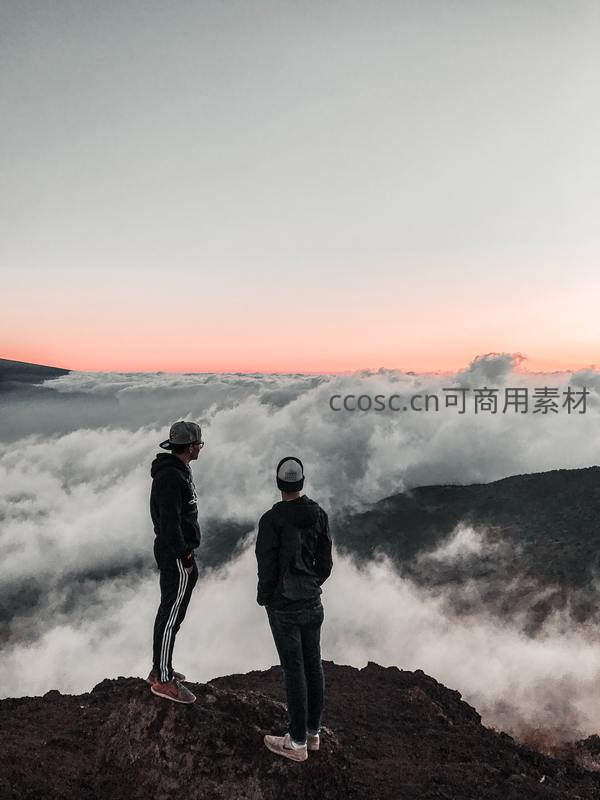 两位年轻人并肩站在火山口边缘,脚下是翻腾的云海,远方天际染上粉红霞光,共享震撼心灵的绝美时刻。
