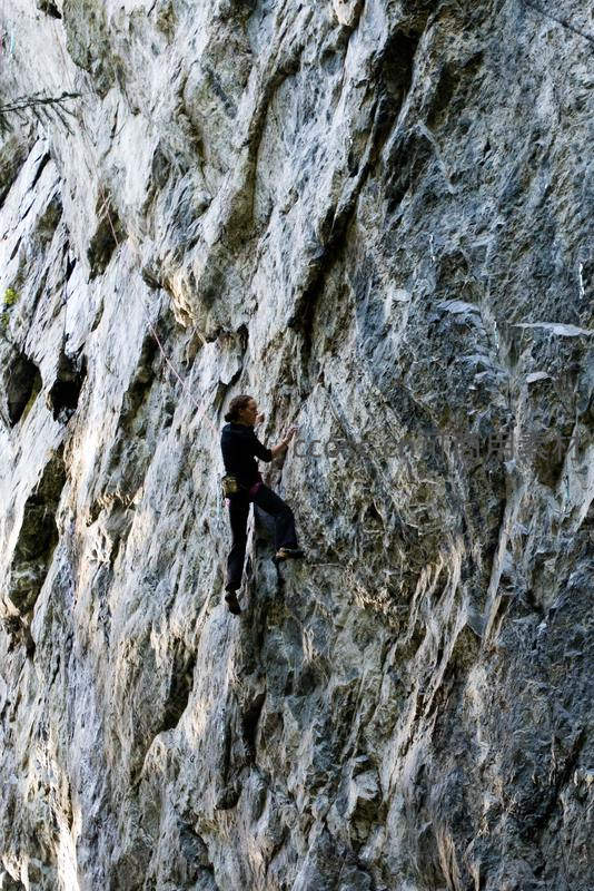 一位女性攀岩者正专注地向上攀登近乎垂直的石灰岩峭壁,她紧握岩点,身体紧贴岩面,展现了惊人的力量、技巧与无畏精神,是对自我极限的挑战。