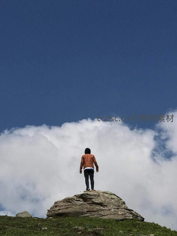 人物背对镜头伫立于山顶巨石之上,脚下是翻涌的云海,头顶是无垠蓝天,营造出超脱尘世的冥想氛围。