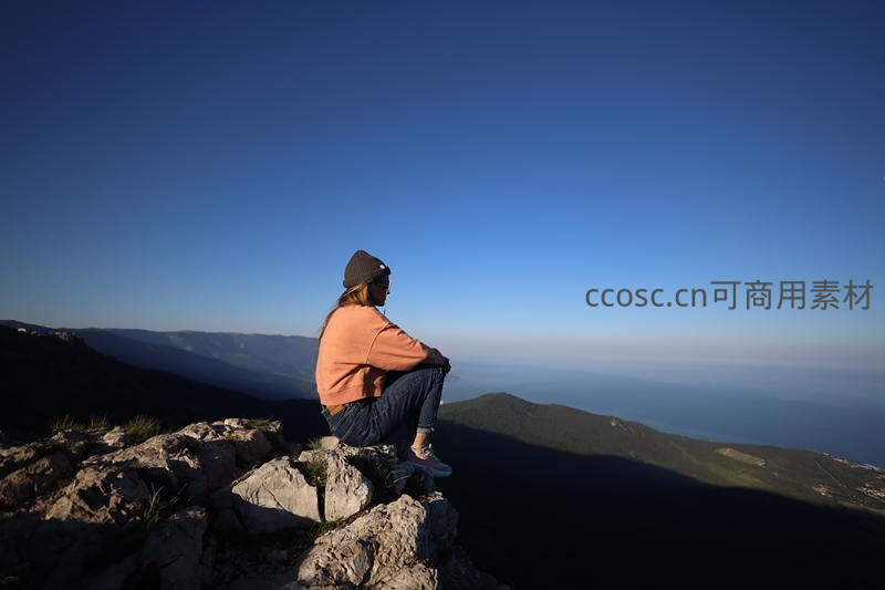 一位旅人独自坐在岩石山巅,背对镜头凝望远方的山脉与海洋,夕阳余晖洒在身上,天地辽阔,心境悠然自得。