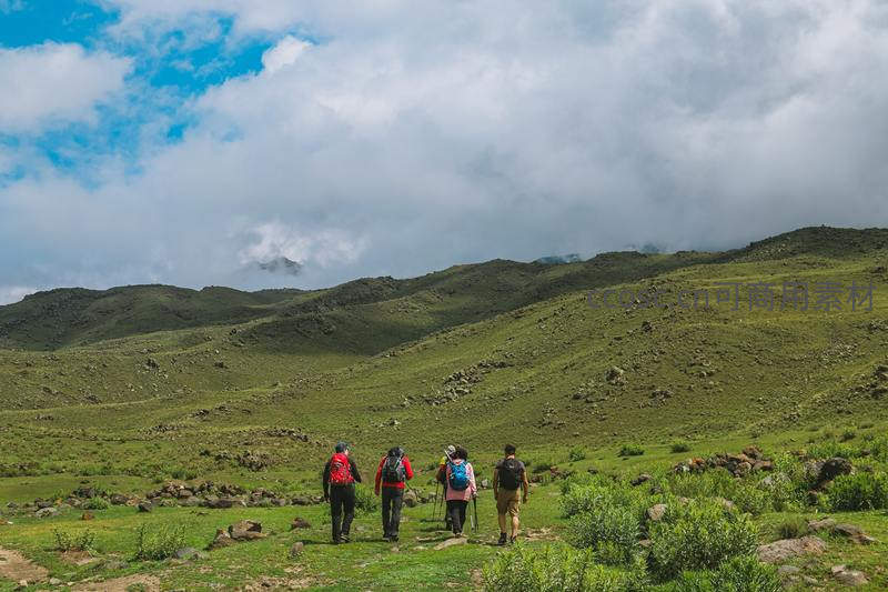 几位背包客行走在翠绿起伏的山丘之间,头顶蓝天白云,脚下是柔软草地与零星石块,享受大自然赋予的清新与自由。