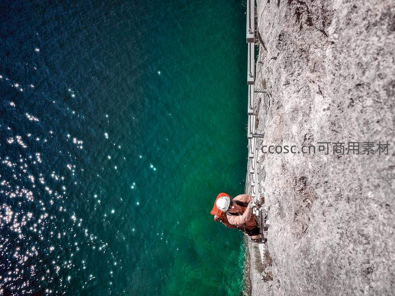 攀岩者俯瞰碧绿海面挑战垂直峭壁
