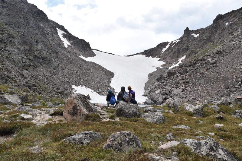 三位旅人在高海拔山谷中席地而坐,面前是尚未融化的积雪和嶙峋的岩石,共同享受着远离尘嚣的宁静与壮美。