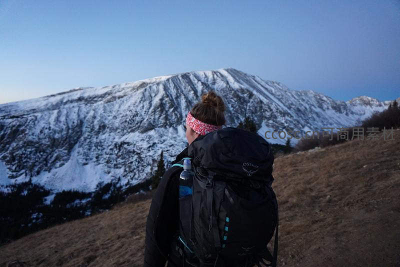 一位背着大背包的徒步者站在山坡上,凝视着前方被白雪覆盖的巍峨山脉。天空湛蓝,景色宁静而壮丽,展现了人与自然和谐共处的瞬间。