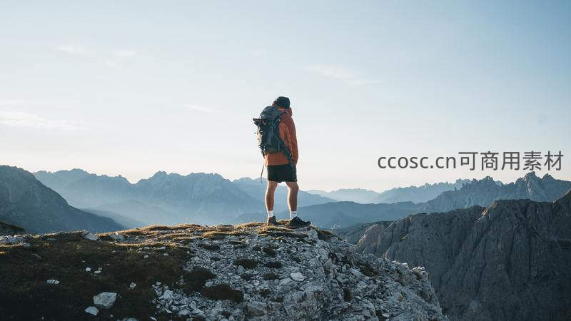 一名穿着橙色外套的登山者独自站立在岩石峰顶,背对镜头,眺望远方层层叠叠、云雾缭绕的山脉。阳光洒落,画面充满征服自然的豪情与宁静。